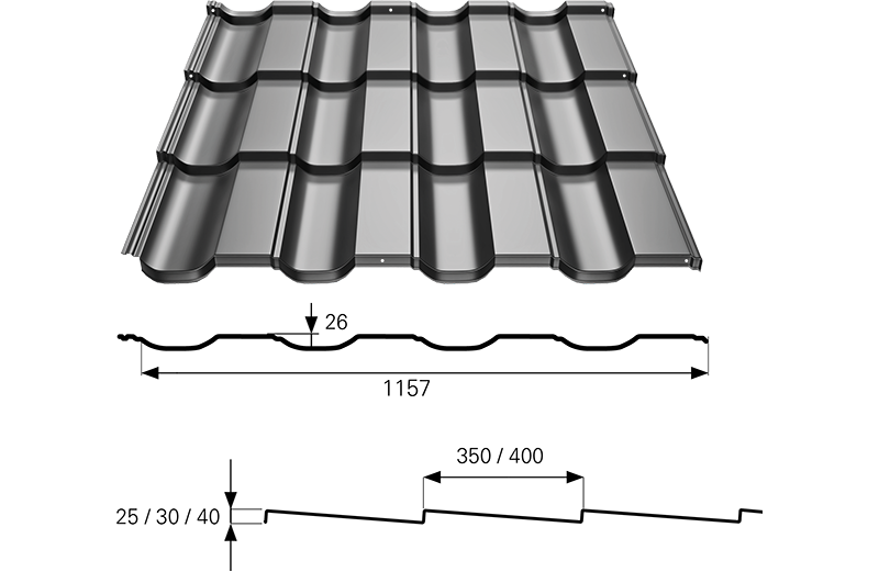 Steel roof tiles HETA with ribs with the height of 30 mm and 40 mm have installation holes on the vertical ribs.